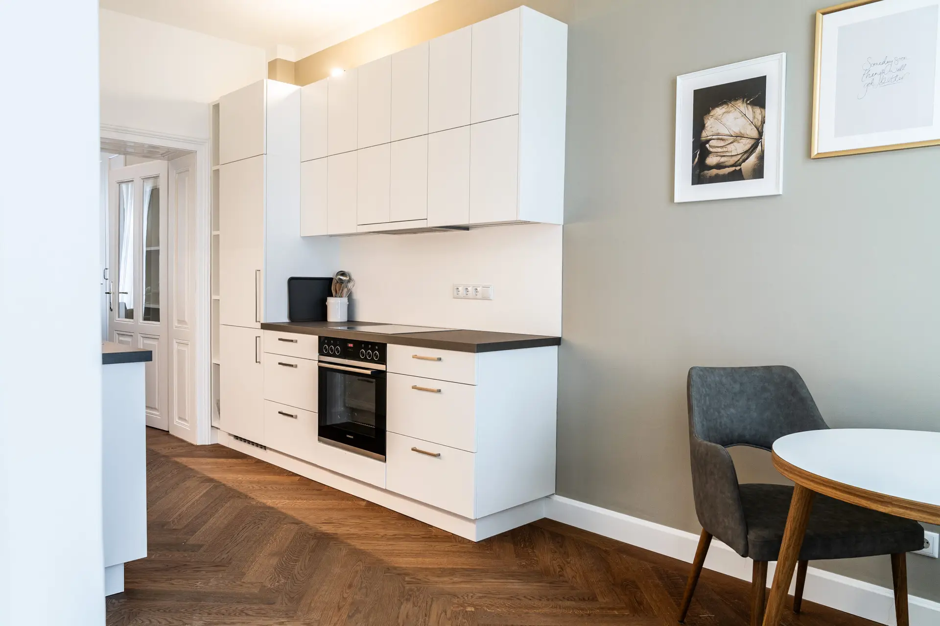 Diese Wohnung bietet alles, was man für ein komfortables Leben mitten in der Stadt braucht. Über die Küche mit integriertem Essbereich gelangt man direkt ins Badezimmer mit WC und in den großzügigen Wohn- und Schlafbereich mit elegantem Fischgrätparkett.